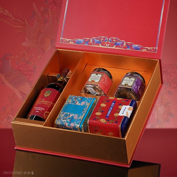 Hộp Quà Tặng Cát Tường La Carminaia Vino Rosso d’Italia mang hương vị Ý mềm mại, dễ uống với chai vang đỏ La Carminaia thanh lịch. Đi kèm trà Anh, bánh quy Đan Mạch và hạt dinh dưỡng nhập khẩu, tất cả được sắp xếp tinh tế trong hộp ép kim sang trọng. Món quà gửi gắm lời chúc cát tường, may mắn và viên mãn, phù hợp biếu Tết, tặng đối tác hay khách hàng.