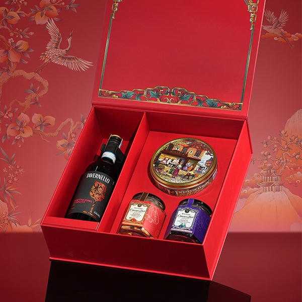 Hộp Quà Tặng Phát Tài Tavernello Montepulciano d’Abruzzo là sự kết hợp tinh tế của 4 món cao cấp: chai vang đỏ Ý Tavernello Montepulciano d’Abruzzo, hộp bánh quy Đan Mạch Jacobsens và 2 lọ hạt dinh dưỡng. Thiết kế hộp giấy ép kim cao cấp, dập nổi họa tiết, màu đỏ cam sang trọng, thích hợp làm quà biếu doanh nghiệp hay người thân trong dịp Tết và lễ trọng đại, thể hiện trọn vẹn sự sang trọng và phát đạt.