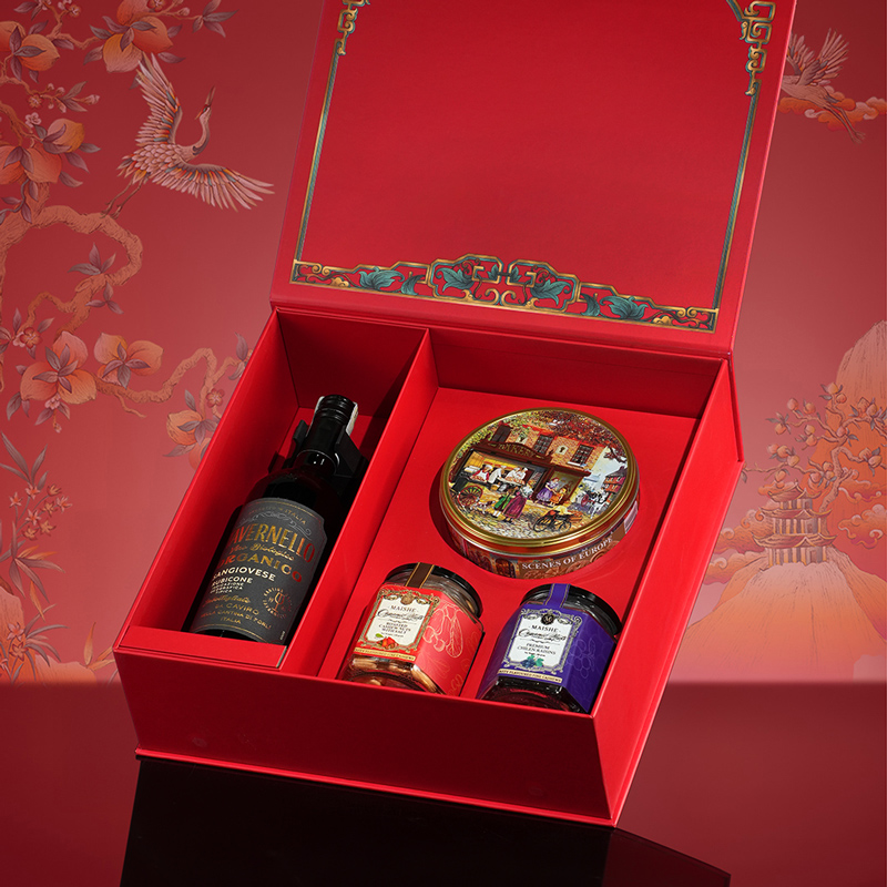 Hộp Quà Tặng Phát Tài Tavernello Organico Sangiovese Rubicone kết hợp tinh tế 4 món cao cấp: chai vang đỏ Ý hữu cơ Tavernello Sangiovese Rubicone, hộp bánh quy Đan Mạch Jacobsens và 2 lọ hạt dinh dưỡng. Hộp giấy ép kim sang trọng với họa tiết dập nổi, tông màu đỏ cam nổi bật, tạo nên quà biếu sang trọng, ý nghĩa cho Tết và những dịp lễ trọng đại, thể hiện phong cách tinh tế và phát tài.