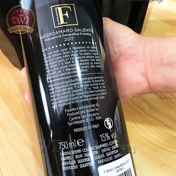 Negroamaro là “viên ngọc đen” của vùng Salento. Loại nho này mang vị chát mạnh, thơm mùi trái cây chín, tiêu đen và có độ sâu màu sắc cao. Chính vì thế, nó rất phù hợp với các dòng rượu vang đậm vị như F Gold.